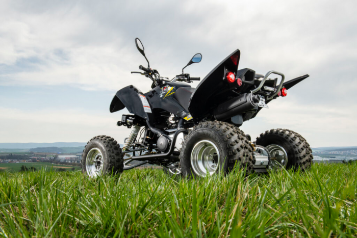 Sportovní čtyřkolka T3b, kapalinou chlazený jednoválec 360 ccm, SOHC, automatická převodovka F.C.C., H/L/N/R, pohon 2×4, 3x hydraulická kotoučová brzda, pancéřované brzdové hadičky, nezávislá dvojitá A-ramena vpředu, kyvná vidlice vzadu, hydraulické tlumiče, přední ochranný rám, hliníkové nášlapy, LED zadní světla, ALU disky, značkové pneumatiky Kenda, originální polepy od firmy 3M.